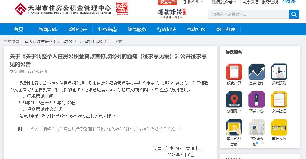 近日,天津市住房公积金管理中心发布关于《关于调整个人住房公积金贷款首付款比例的通知(征求意见稿)》公开征求意见的公告。